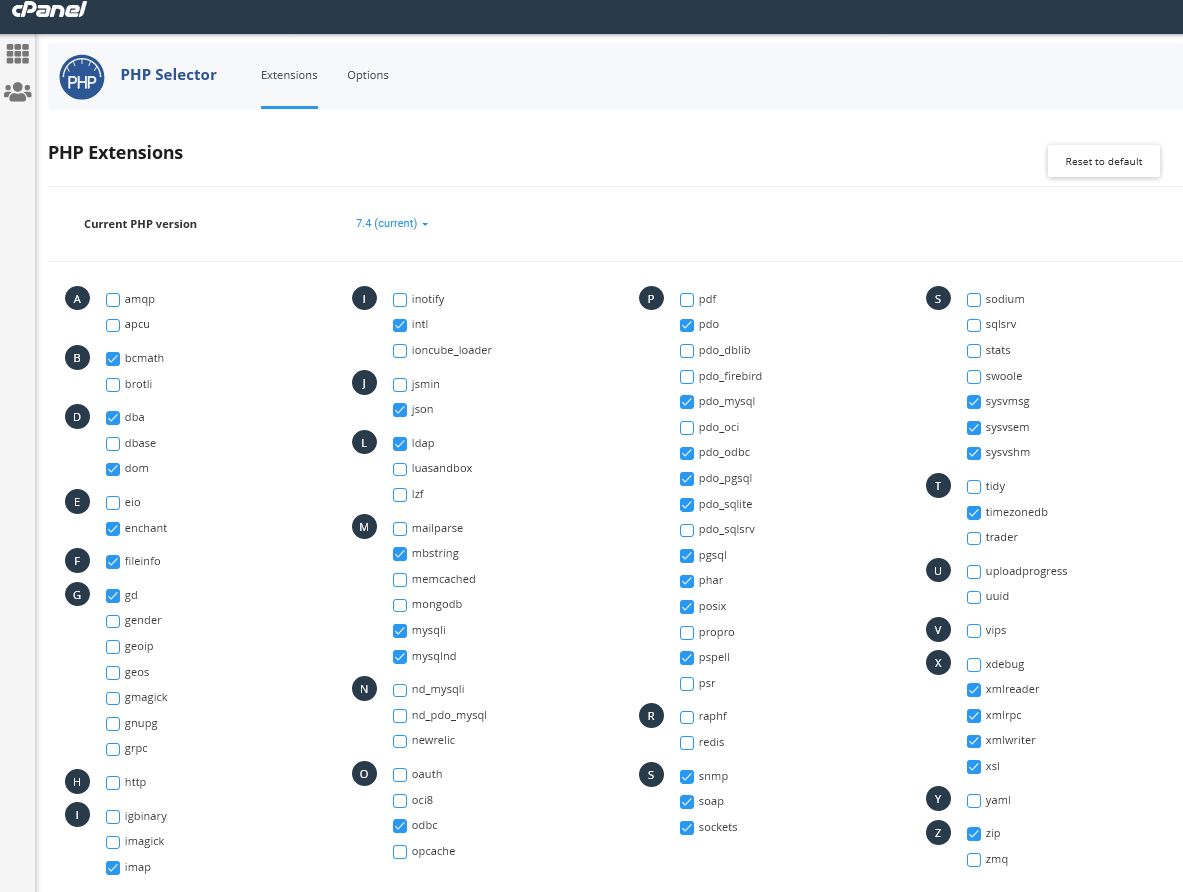 Modulele PHP necesare se pot activa din Cpanel / Software / Select PHP Version / PHP Extensions.